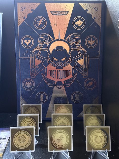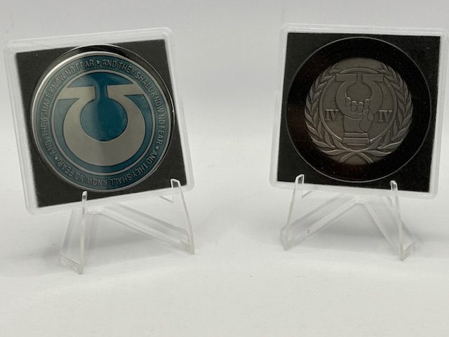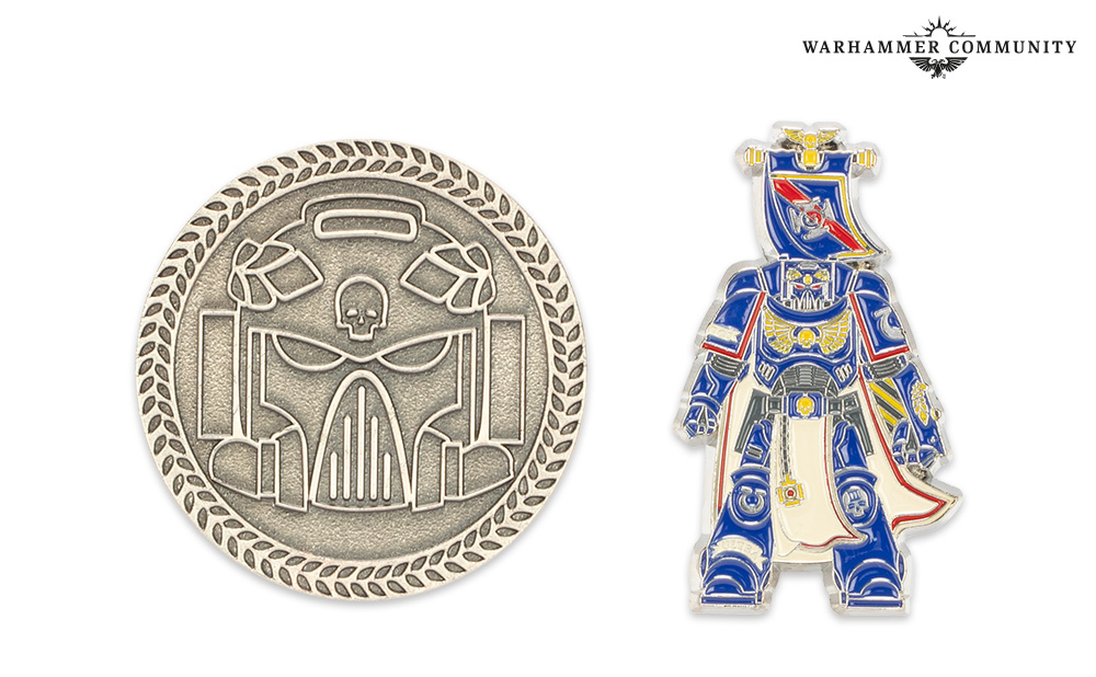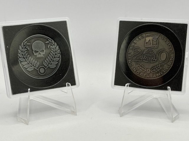 global Warhammer store celebration, where the coin on the right could be obtained alongside an enamel pin. Here is the "heads" side of the Celebration coin (as well as the enamel pin):