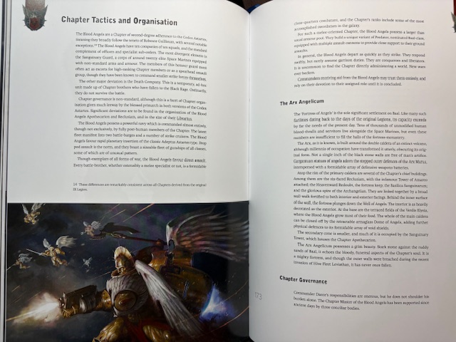 Inside, there's a full section on each of the nine Loyalist Chapters. Not just their history, but their martial organization, notable members, and more. Ever wondered how the Blood Angels wage war? Here you go.