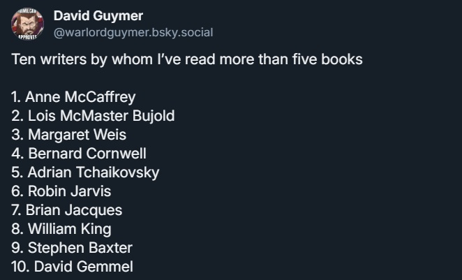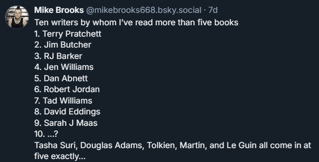 Finally, in one of those "list challenges" that sometimes echoes around social media, last week there was one where folks were tasked to name ten authors they'd read five or more books by.