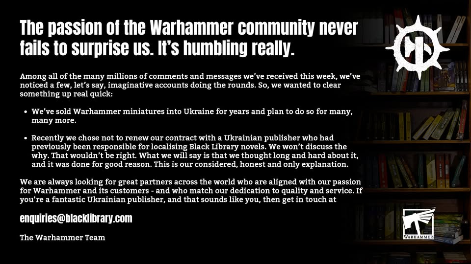 Molfar, the company responsible for Ukrainian translations for the Black Library, announced that they'd lost the contract.