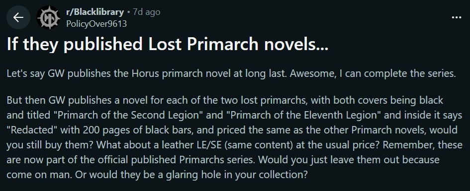 u/PolicyOver9613 posited an interesting question: if Games Workshop released novels for the Lost Primarchs in the same style as the rest of the books in the Primarchs series, would you buy them even if there was no actual content inside?