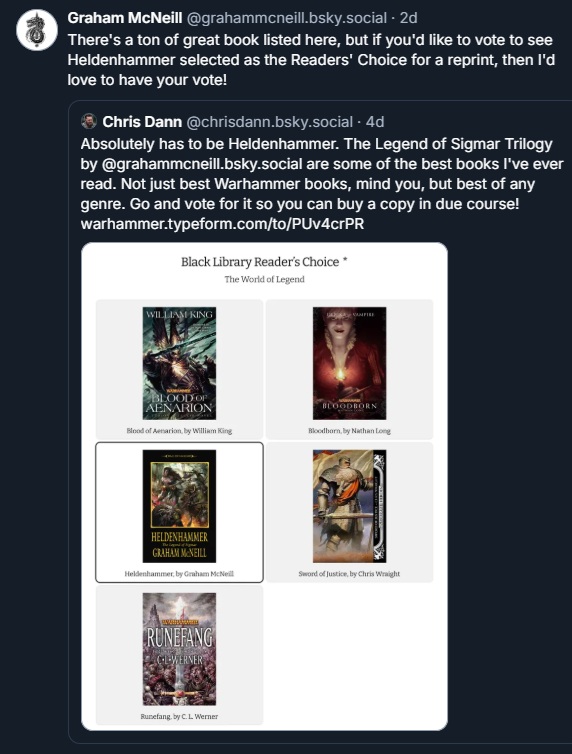 Just as in years past, the Black Library presented us with a list of books eligible for next year's Readers' Choice Reprints and asked us to vote for one in each category (40K, Fantasy).