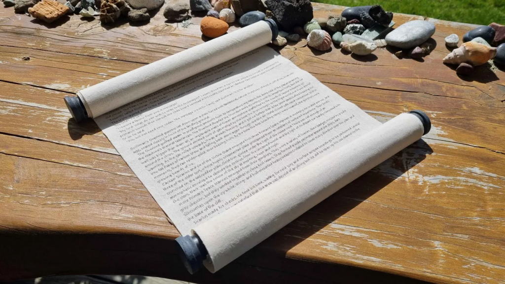 "I'd thought about books since I know how to book bind, but short stories are just as the name says pretty short. So instead of collecting a bunch of random shorts into a book I thought this would be a fun format. I don't have a printer that can do long fabric pieces, so it's all handwritten on the scroll."