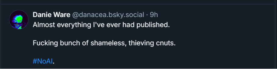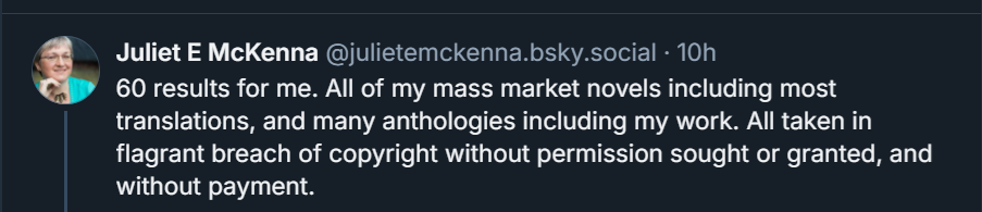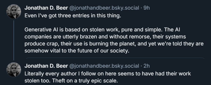 "And that's not just authors, that's script writers, editors, artists, composers. There have already been multiple instances of publishers large and small using AI-generated cover art instead of commissioning a human artist, and at least one author I know is convinced that an edit pass on their novel was done by AI, not to mention many publishing outlets reporting a massive increase in obviously AI-authored work being submitted.