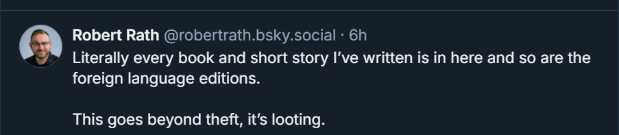 "They have enough money that they could have bought one copy of the greatest works of literature from around the globe to train their AI on, but no. Why buy anything when you can just steal it? Infuriating doesn't begin to cover it."