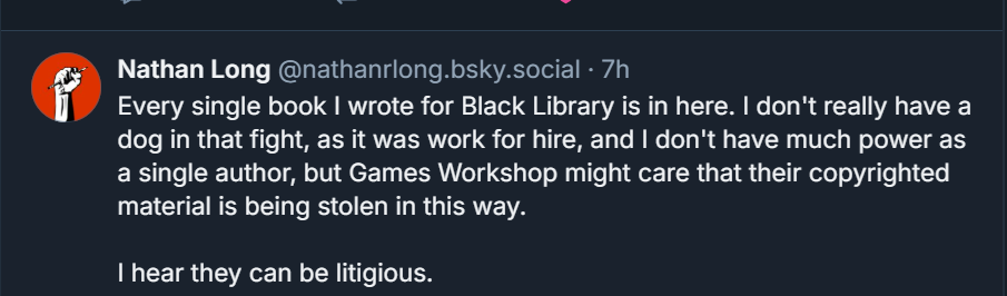 For our Black Library authors, writing for established IPs means they’re in something of a limbo, watching their works get devoured to feed the AI beast while having to hope that the copyright-holders pursue action to enforce their rights. By the same token, most of them also write completely original works that they could seek to enforce copyright on, but that itself remains an expensive proposition with questionable hope of practical effect.