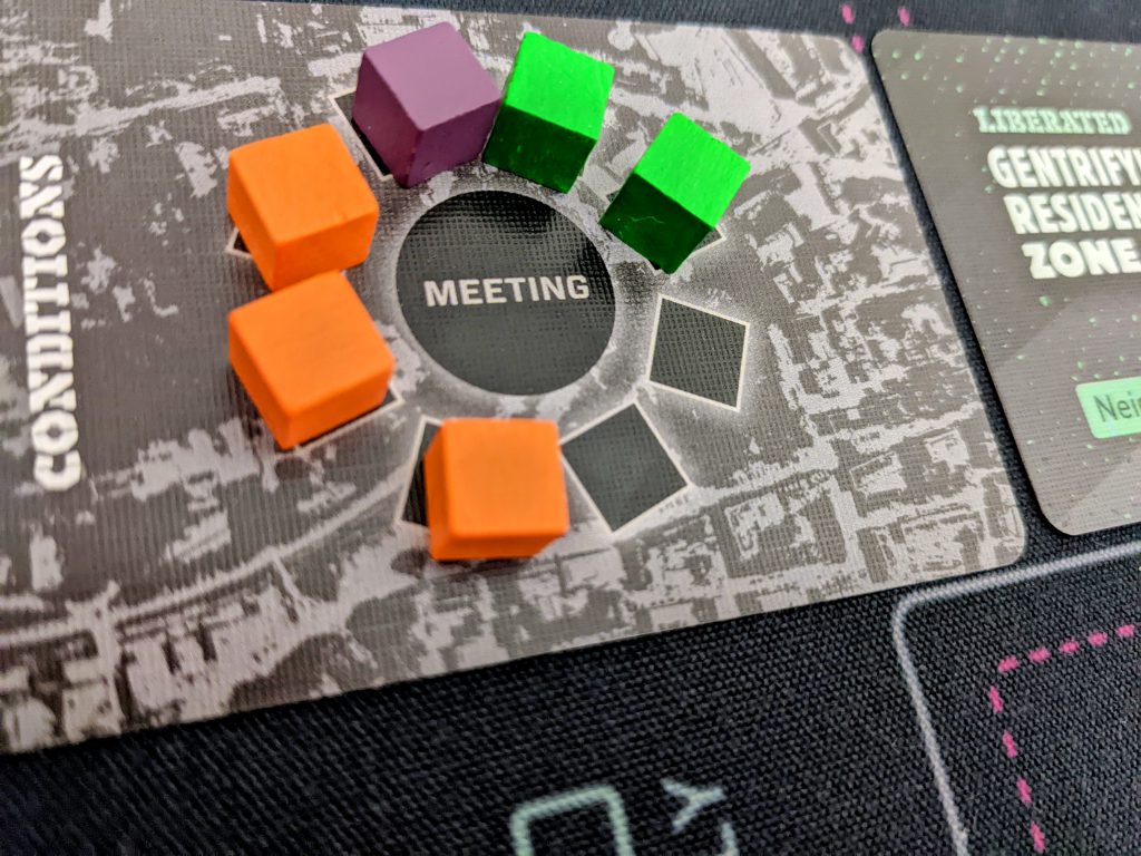 • Conditions Cards (aka Meeting Cards). This introduces a new action (attending meetings) and victory condition (a sort of liberation “quest”). The game starts with a visible, double-sided condition card showing a specific city tile that must be liberated. Any player can satisfy a condition card, but each player must satisfy one condition card for a full coop victory. The card backs are meetings with open slots to place cubes. As an action a player can send one or more faction cubes from one block to the meeting card as an action. At the end of the round if there are more cubes on the meeting card than face up Conditions, then a new Condition can be revealed. More Conditions can be revealed than are required, but this complicates things since subsequent Conditions require more cubes to be spent at more meetings.