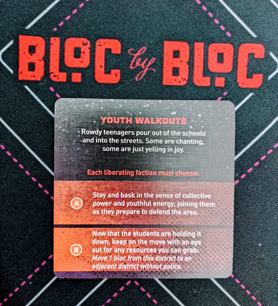 It's just as well that the third edition of Bloc by Bloc is subtitled "Uprising," because in 2022 ideas and causes are often an eruption (or disruption) of words. And in Bloc by Bloc: Uprising, words matter. From the factions you adopt (Workers, Students, Neighbors, Prisoners) to the Liberation stories you tell (”People’s Kitchen” or “Guerrilla Gardens” or “No Justice, No Peace”) to the graffiti that you spray on the walls (”Smash the State” and “Our Streets” and “