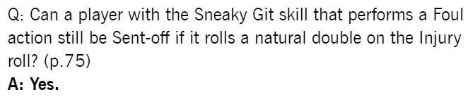 Dan: Y’all get ready for something stupid. On page 75 of the Blood Bowl rulebook, the Sneaky Git entry states that a player with Sneaky Git is “not Sent-off for committing a Foul should they roll a natural double on the Armour roll”. Pretty straightforward, right? Well, in this FAQ it says: