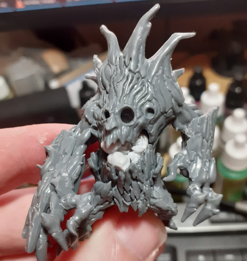 The Treemen are getting painted in two pieces, with the face separate so I can paint the hollow interior. Everything received a zenithal priming with the airbrush (Black > Vallejo French Mirage Blue > Vallejo Pale Sand > drybrush white > lowlight with nuln oil).