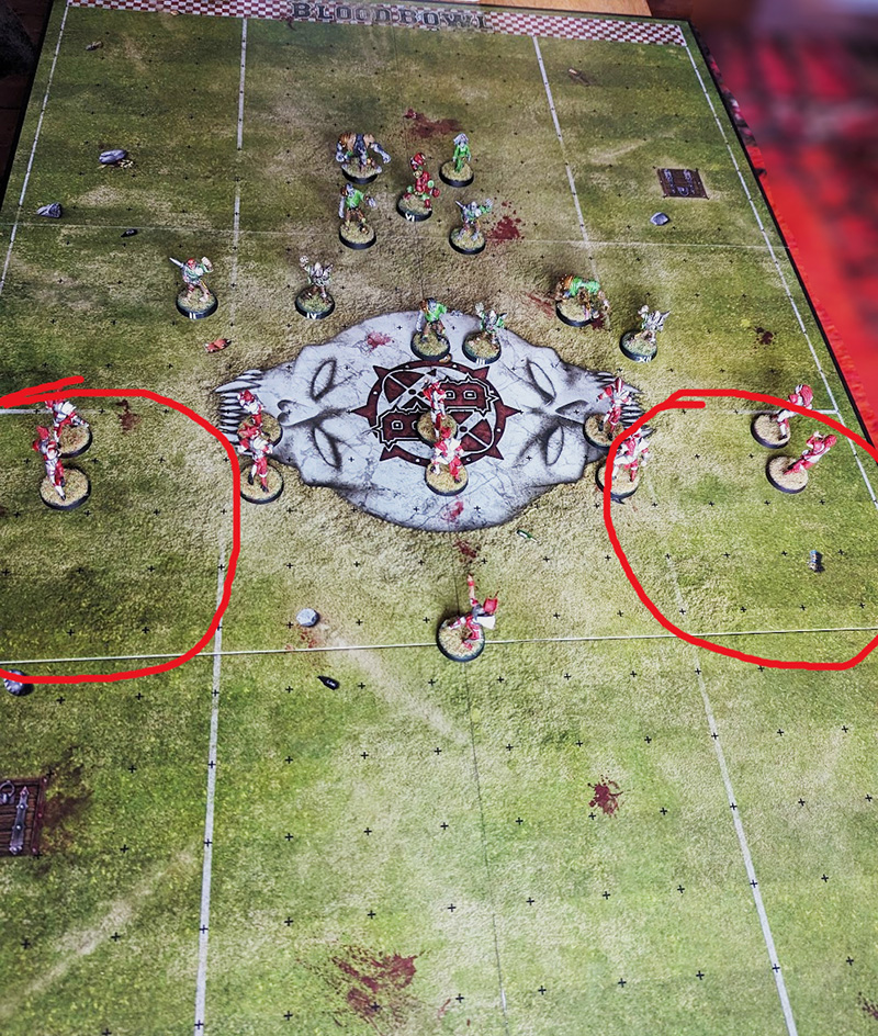 You should have have enough free players to form some kind of initial cage around your ball carrier, and ideally enough to also ensure that your opponent cannot drive a wedge between your front line and the cage on their first turn. You can make the call on exactly how many players this will require, and where, when you have seen your opponent’s defensive set-up, and taking into account the team race. Against Agility teams, deep kicks give them the greatest opportunity to create a wedge, while short kicks and a Blitz can instantly give them the ball. Against Bash teams, a deep kick is not much threat, but a short kick can mean having to create your cage uncomfortably close to your opponent’s front lines, or not being able to adequately create one at all.
