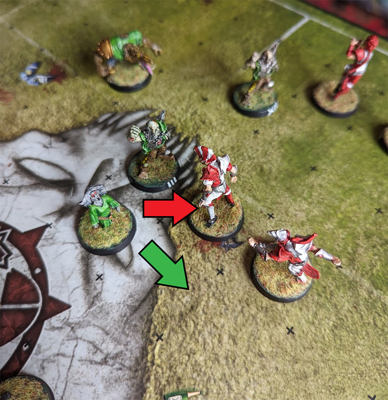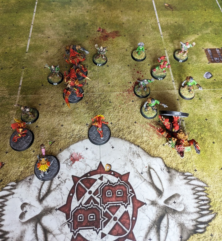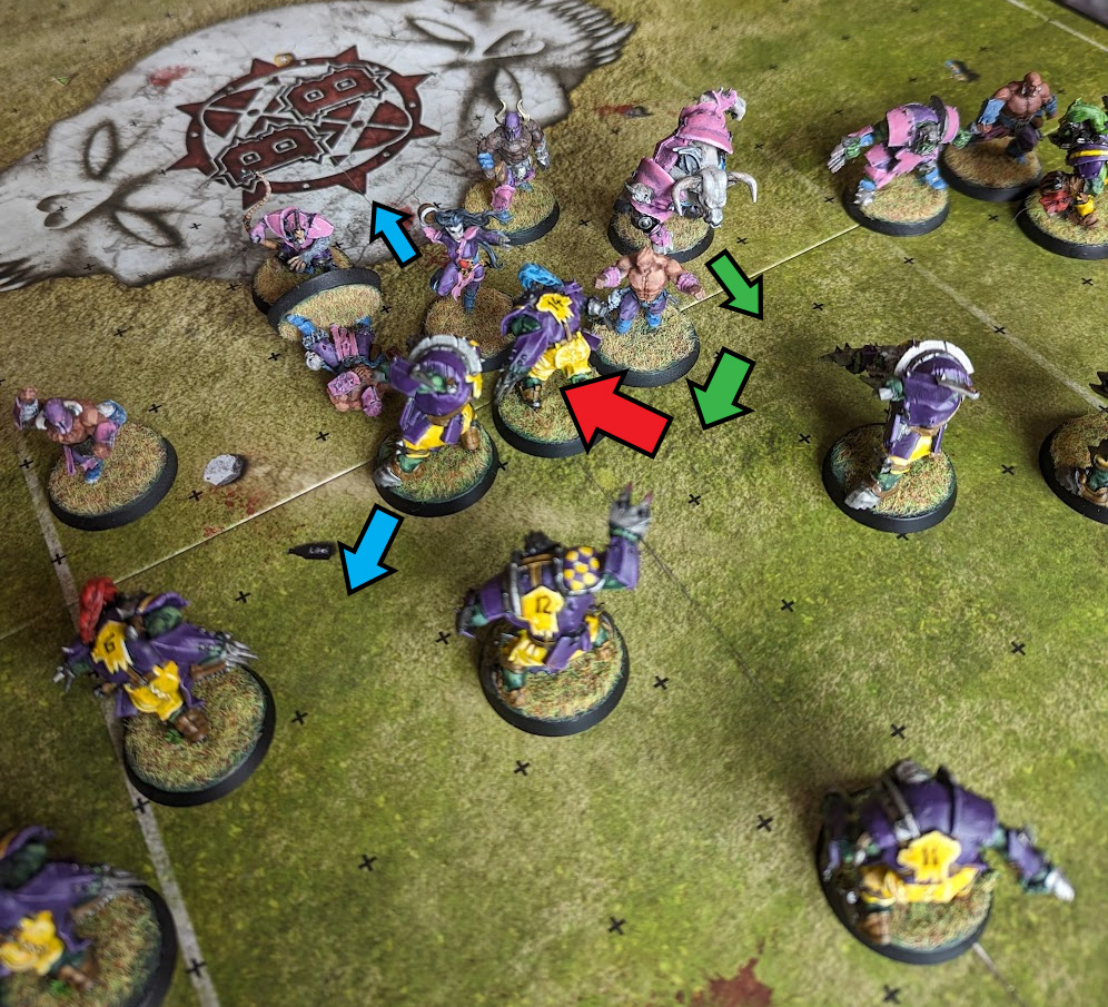 The Orcs have broken the cage and marked the Chaos Renegade ball-carrier, but if the Minotaur Blitzes as shown, any pushback creates a chainpush that can either move the other Orc away or move the ball-carrier to a safer spot