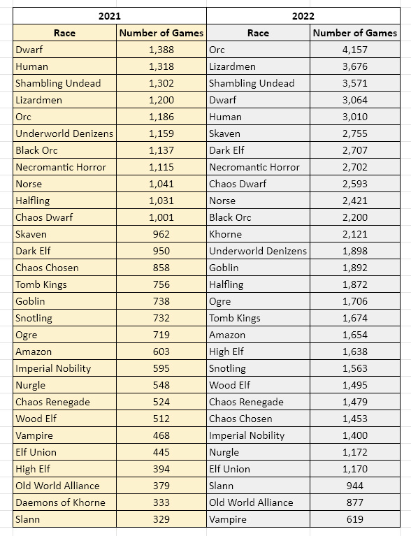 Dropping off the face of the Earth are Halflings, who were our 9th placed team in 2021. Undoubtedly this fall is due to various star-based builds getting slapped down by TO’s and FAQ's. We'll see if the recent arrival of some low-cost Halfling Stars causes any change in 2023.