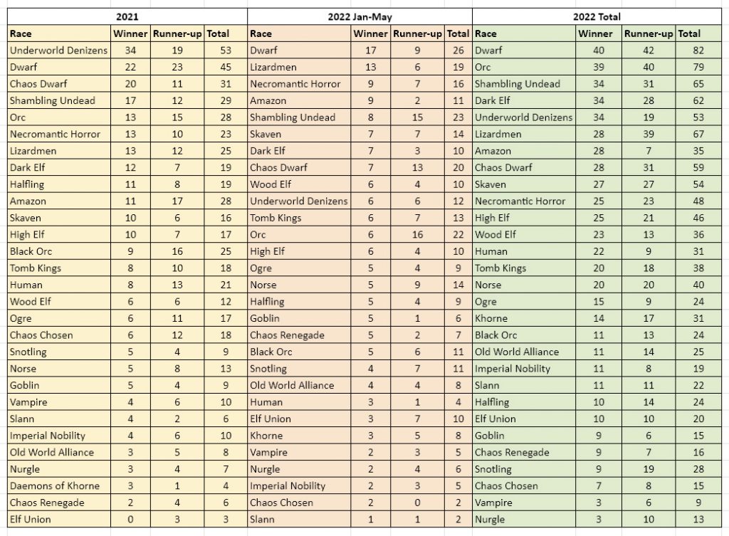 These three ranked 2nd, 4th, and 5th overall in 2021, so there has not been a huge shift, but the main losers have been Underworld, who have fallen back into a still-creditable 5th spot. The other faller are Chaos Dwarves, who in 8th place remain a very popular and successful team, but have a more even proportion of Runner-up to Winner spots than they did in 2021.