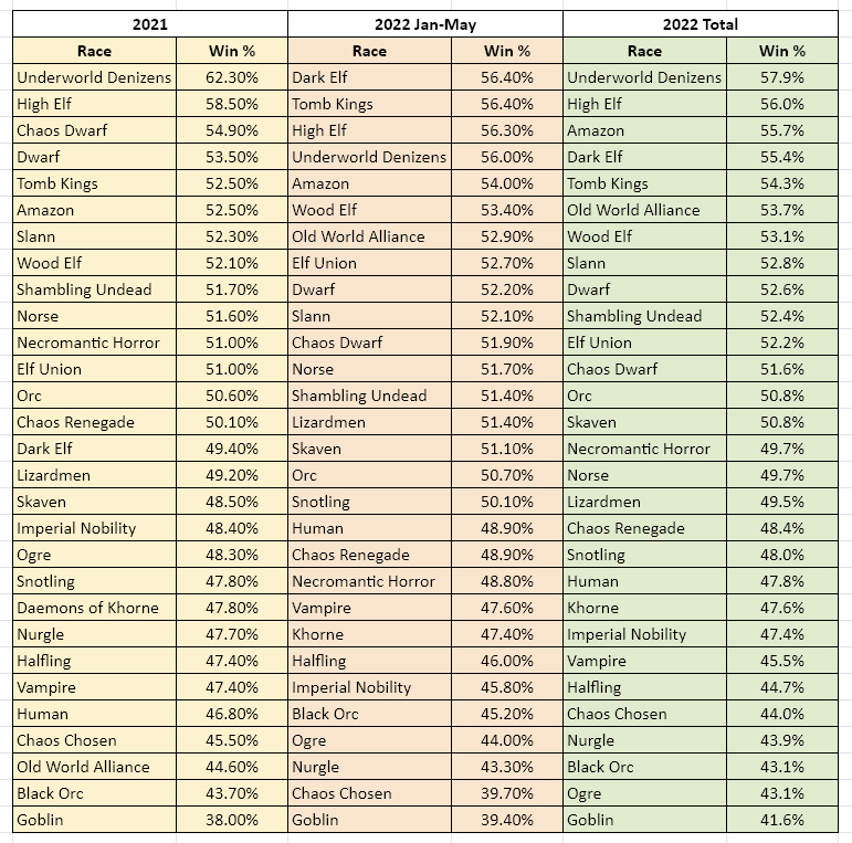 Black Orcs certainly seem to have found their level, and it is not good. Early 2022 win rates had improved, but they have finished almost exactly where they did in 2021 with 43.1%, the third-worst in the game. This is a team that still sometimes finds itself in higher tiers in rules packs, so this might be something for TO’s to take a look at and give Blorcs some help.