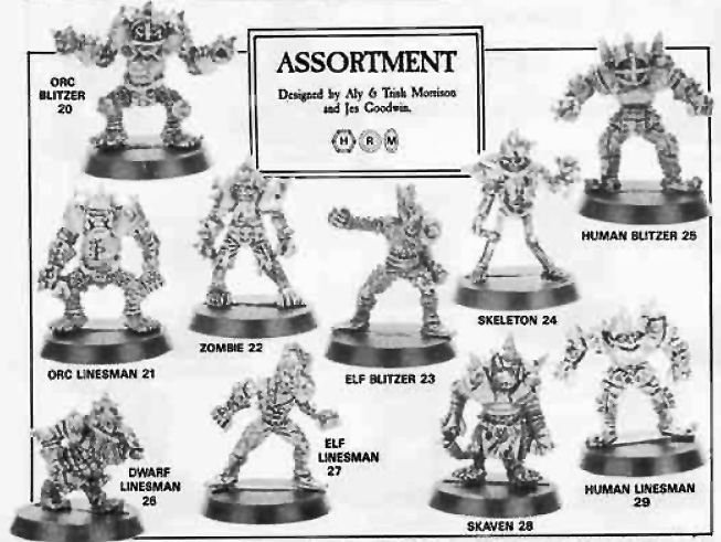 These minis certainly embodied the aesthetic that the rest of the game art had established. An almost-American Football look, with some more fantastic and lethal touches (i.e. spikes). The Skaven is quite notable as they had been introduced to the world of Warhammer only months before, and the Skaven Blood Bowl team and its accompanying lore, included in White Dwarf #86, was one of their first major appearances in any GW product.