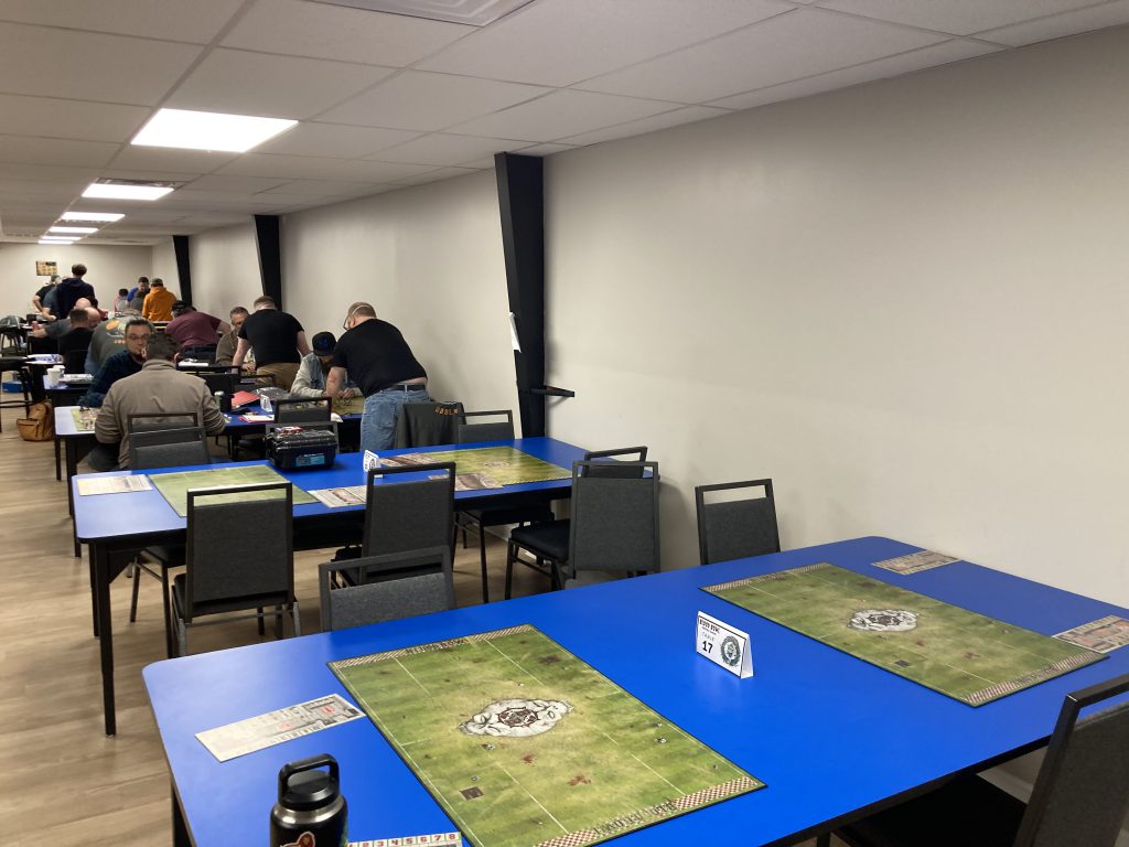 Through the back of the shopping area, though, is what really blew me away. The gaming space was seriously huge. A mixture of solid, formica card tables and high-top standing tables, with an aisle down the center giving coaches plenty of space to walk up and down and observe. Even better, the tables were already laid out with pitches, dugouts, and table numbers before coaches even started to arrive - a level of organization that most Blood Bowl tournaments can only hope to aspire to!