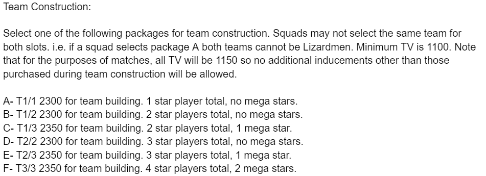 This, reader, was my first squad* tournament of the year. I’ll be honest, I’m not a big fan of squad tournaments. They tend to have overwrought player packs, with team- and squad-building rules that require a lot of coordination and horse-trading between coaches in the buildup to the tournament.