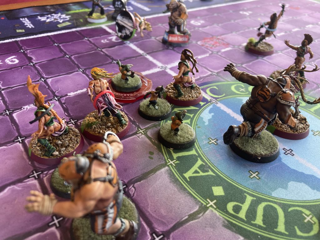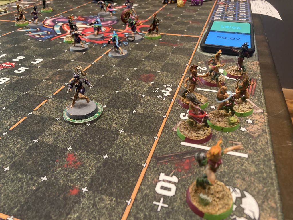 I managed the crowdsurf, and the crowd was bloodthirsty - Luke’s Leader went straight into the Casualty box, with no hope of returning. Luke managed to knock out the Wardancer in return, but that meant I still had Tackle on the field to menace all of his Gnoblars. He put up a spirited defense, but I was able to simply outrun his team, switching play to the left flank. I ended up scoring on Turn 4 under heavy pressure, having to dodge my ball carrier away from multiple Tackle Ogres to dash in.