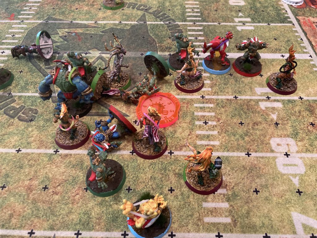 The second half started with a full-on shootout. Gabriel started with a perfectly executed two-turn touchdown, so I replied with a two-turn of my own. With such a heavy loss in the second round under my belt, I knew there was no way to win the tournament. Instead, I was eyeing the spot prizes and aiming for Most Touchdowns. I was happy to let the shootout continue, but Nuffle had other ideas.