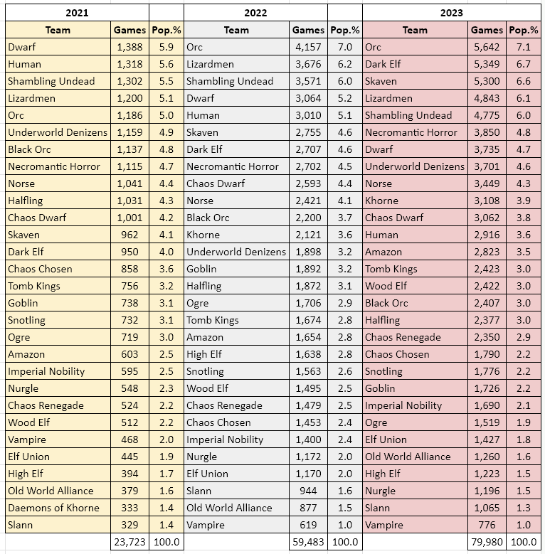 In terms of population, Orcs remain number one, but Dark Elves and Skaven have both increased their share by a considerable 2% from last year to take second and third spots. Unsurprisingly Underworld are also among the big climbers; while Humans, who were in the top 5 most popular teams, have fallen entirely out of the top 10.