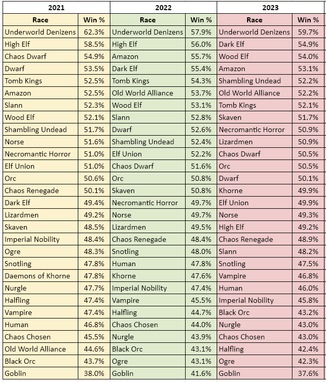Two other better performing teams of note are the previously maligned Chaos Chosen and Black Orcs, both of whom we have highlighted for their weak performances in previous Meta Reports. While neither sets the world alight here, their numbers certainly offer some additional perspective as to their ceiling. Both have some interesting matchup data: Chaos Chosen absolutely dominate any non-Dark Elves, with 70%+ win rates against the rest, while Black Orcs have one of the very best records of all teams against Underworld.