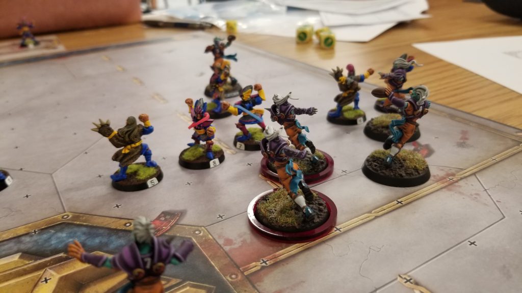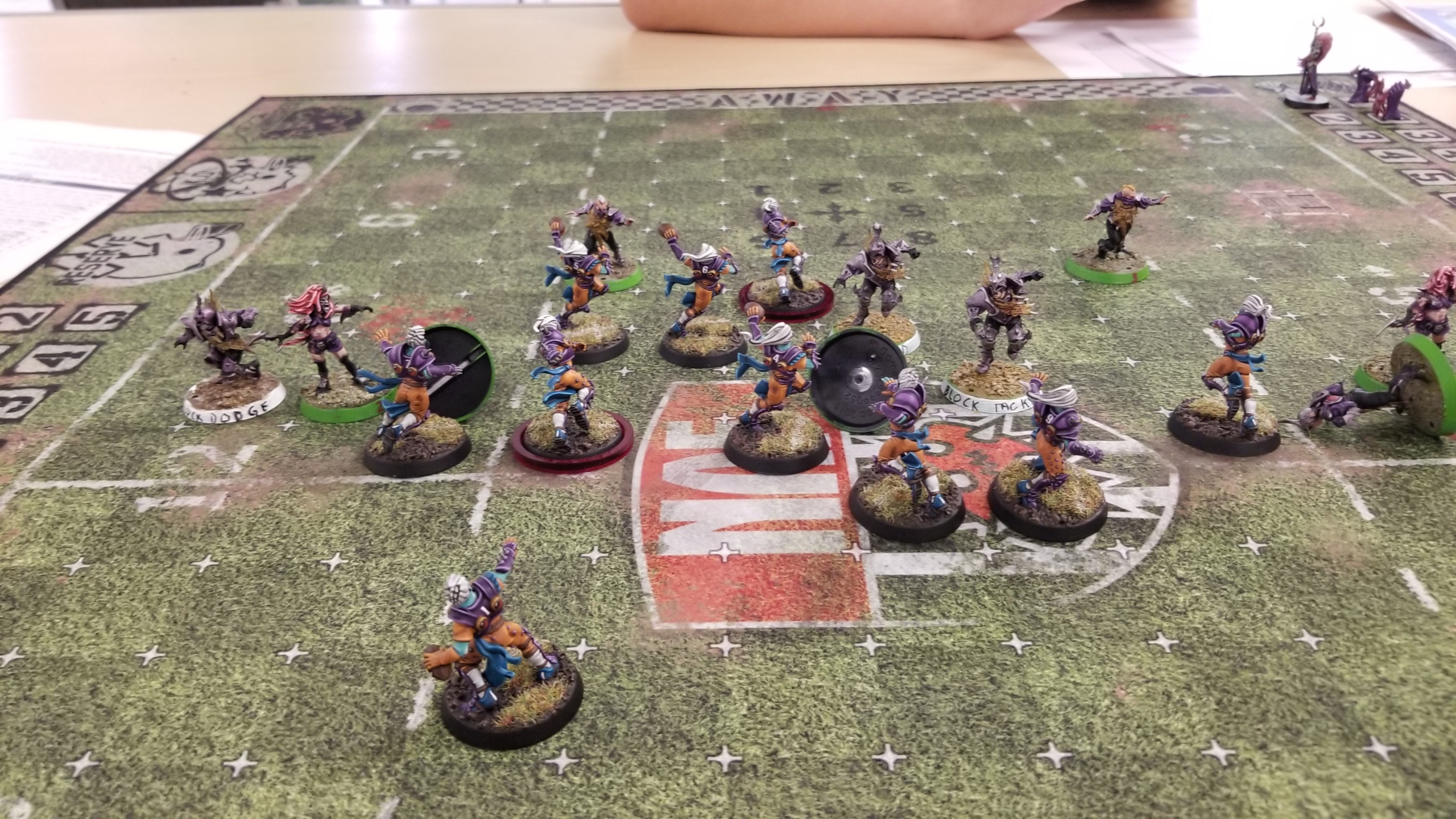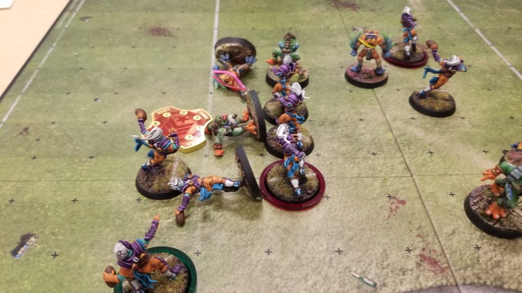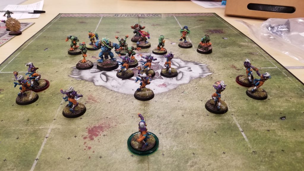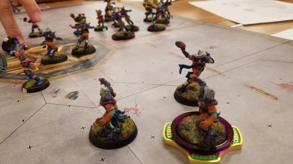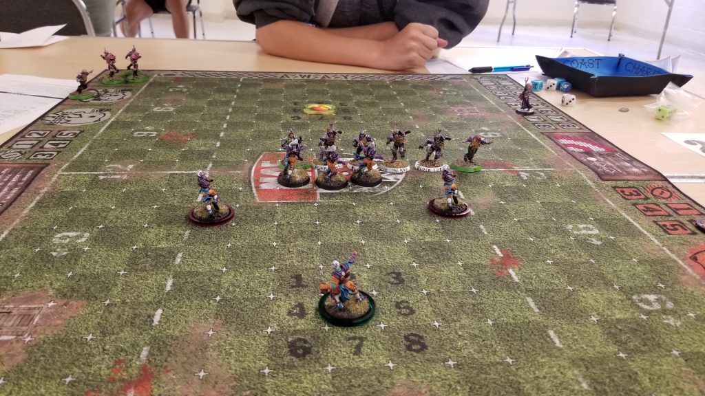 I win the toss and elect to receive. Jessica’s very new at the game, but she was a ton of fun as an opponent. It ended up being an extremely bloody game, with multiple casualties on both sides. At the end of the game it was 6-on-6 as both teams limped to the finish.
