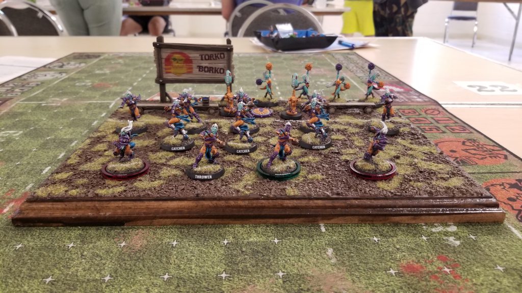 As soon as the matchup was announced, I thought, “Oh, no. Lizardmen!” Local player Mike Brandt runs Lizardmen in my current league and they can be a real problem in an experienced coach’s hands. To my delight and surprise, Temple Run turned out to be a Slann team! Denny, my opponent, had brought the NAF-approved, non-official-yet-somehow-legacy frogmen team! I was extremely pleased to see this, as I had never played with or against Slann before. If you’ve never seen or heard of Slann before check out their roster to see what they can do.