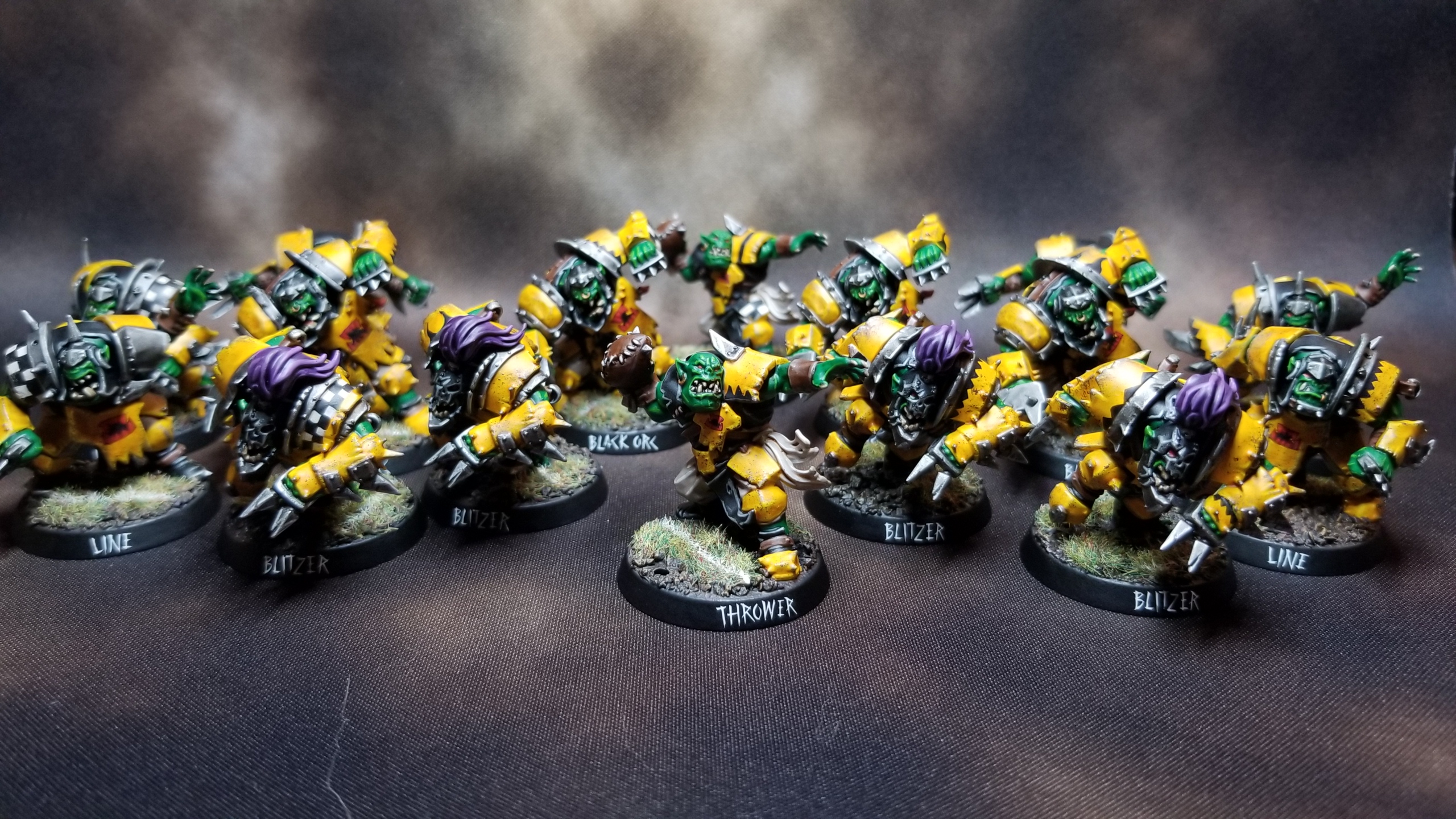 600k, no skill pack, just like last month’s 4 Diamonds Cup. Since that event was fresh in my mind and I was planning to use them for Slaughterday, I decided to leave my elves on their shelves for the Rookie Rumble. That means my Orc team, Da Red Fangz, got the call-up! I haven’t played any organized Blood Bowl with them since 2019, so I was keen to get them back out and see how they did.