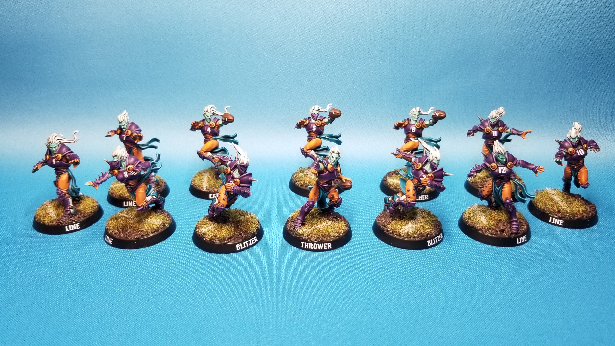 For grown-up Blood Bowl, it was always going to be my pro elf squad, the Baja Blasters. It’s still Pro Elf Summer, after all, and will continue to be until after the Chaos Cup at the end of this month. We were given 1,100,000 gp to build a roster, and since Elven Union was considered to be tier 2, I was able to apply 4 bonus skills to the team: 2 Primaries and 2 Secondaries. It’s a light skill pack, for sure, but that’s fine. Just means that there’s less to think about, which is always good for me!