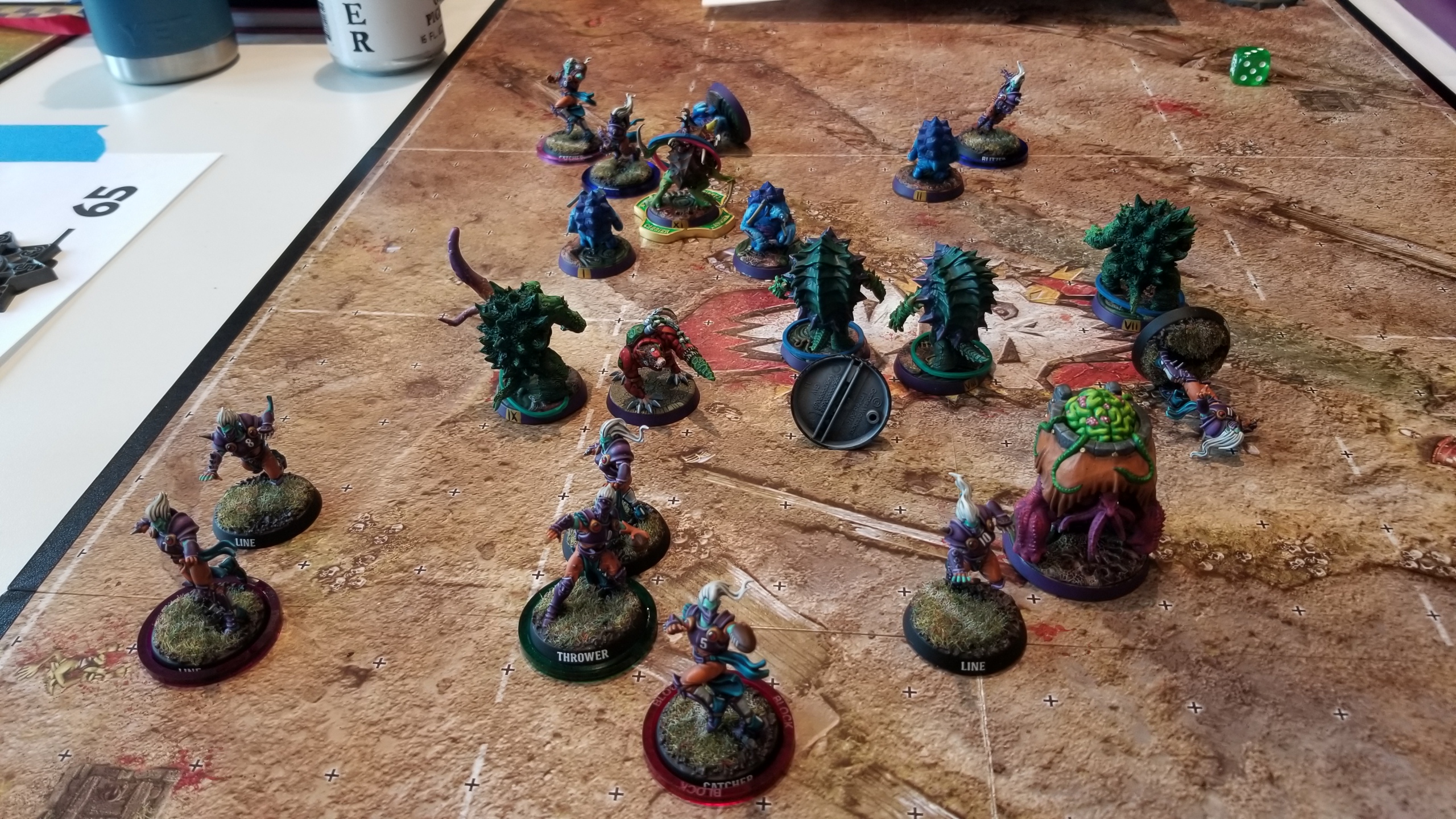 Right off the bat, I’m thrilled for two reasons: first, my podcast partner SRM would love the Godsmack reference, and second, this is a near copy of my friend Joe’s team with whom I managed to get a practice game in before the tournament! Now, that practice game went horribly for me, but that’s ok because I knew what to expect. Chris was going to try to foul and bash his way to victory, while using his goblins’ inherent dodginess to get out of any trouble. Also, Chris was super nice, as befitting someone from Minnesota, and he gave me a set of 2d6 with little stylized Minnesotas on the 6s that I ended up using for the entire tournament! After we exchange rosters, we sit down and get to rolling. It’s nice weather and I’m receiving the opening kick. My plan is to score quickly before I lose too many players, but a wrench is immediately thrown in the works: the kickoff table result is changing weather, and a sudden rainstorm has erupted around the pitch, making it more difficult to pick up or catch the ball! Undaunted, we soldier on and begin the game.