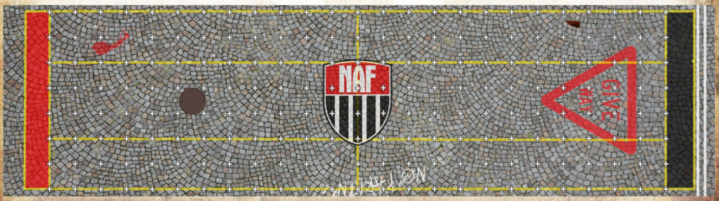 The pitch is incredibly narrow. There are only 3 squares in the center pitch, and 2 in each wide-zone. This means the field is only 7 squares wide, but has the same length as a standard Blood Bowl pitch. The endzones are open to the crowd, but the sidelines are treated as walls. The walls prevent crowd-surfs and out-of-bounds balls, but still cause plenty of chaos! Positioning is extremely important in this variant, but more forgiving.