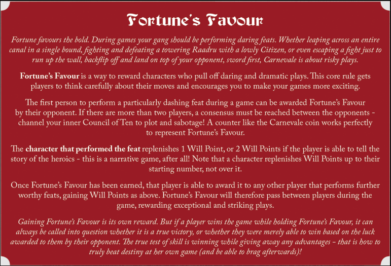 The first failing here is definitional - “the first person to perform a particularly dashing feat during a game can be awarded Fortune's Favour by their opponent”. What constitutes a dashing feat? Is jumping from one roof to another dashing? Is swimming up out of a canal and grabbing an enemy dashing? I honestly don’t know what qualifies and what doesn’t. This isn’t saying “the first person to do something the other person thinks is especially cool or interesting”, as vague as that would be, it’s being more specific than that - dashing. It also suggests “daring and dramatic” as descriptions of actions that should be awarded. It feels immediately that some factions and playstyles are going to be rewarded above others… and there’s already a way to do that, and it’s the entire rest of the rules.