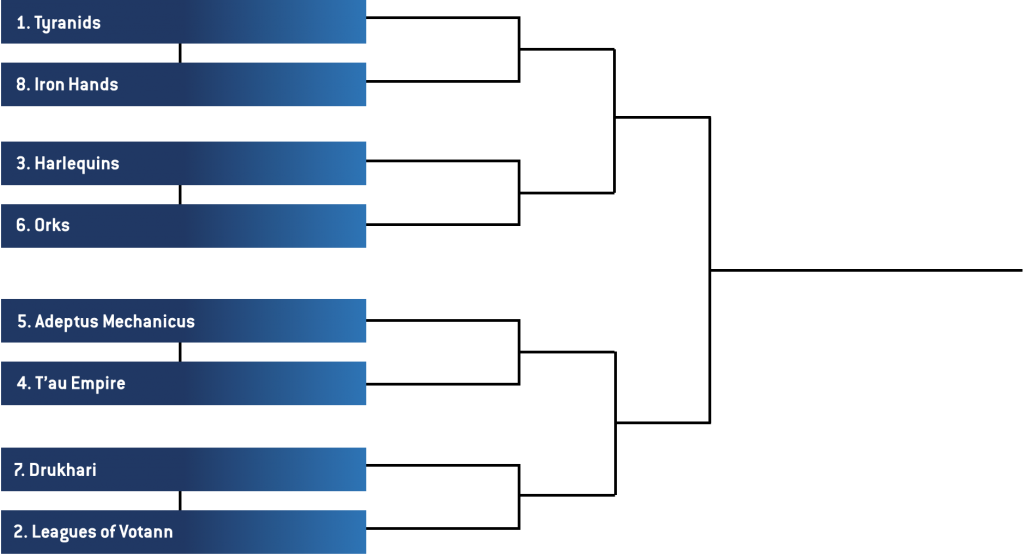 - Adeptus Mechanicus - The Mechanicus have more and better flyers than the T'au and nearly match them in shooting, but trade some of that firepower for durability. This one really could have gone either way, but because these armies face off round 1 it kind of doesn't matter which one is seeded where - we fully expect whoever goes first in that matchup to shoot the other one off the table.