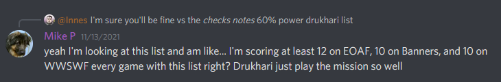 The Drukhari list is one of several near the top that can hold objectives, and they have the ability to actually kill things to boot. This one is heavily in favor of the Drukhari list, and as much as Liam tried to make it easy to score Grind Them Down by killing small units of Kymerae, this T’au list will struggle to do even that. I honestly don't know how the T'au list kills even a single model in the three games it will play. Well, except for the dozens of spore mines it will inadvertently destroy when they blow up.
