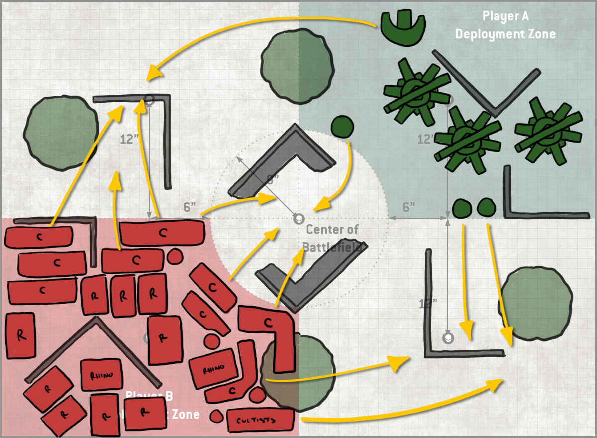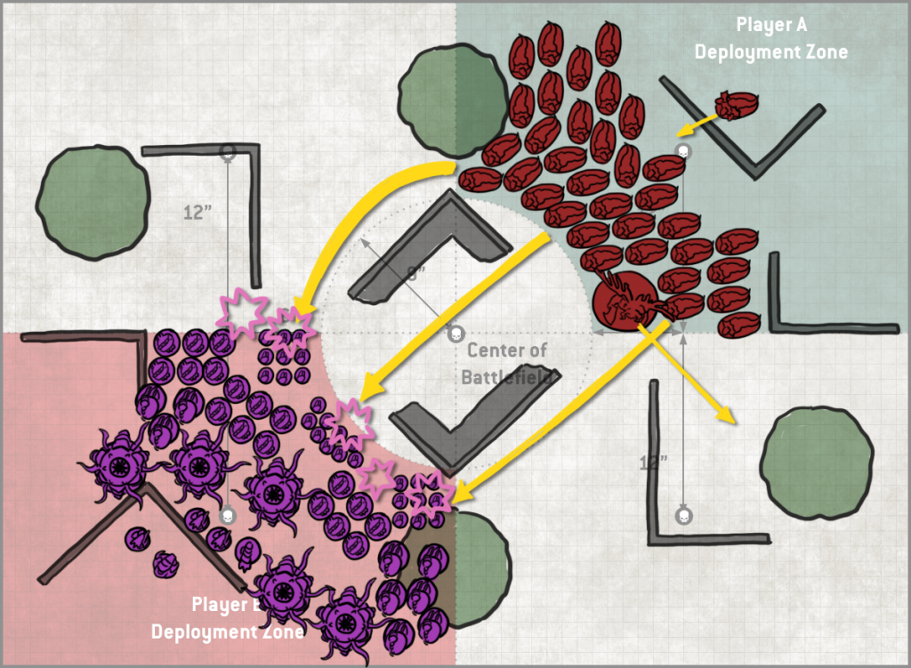We picked a trio of otherwise versatile maps for these three rounds, starting with Sweep and Clear in round 1. This mission helps some of our armies by "having a decent mission secondary that some of them can score," so it should be a good day for our top lists, e.g. the ones that can actually hold objectives.