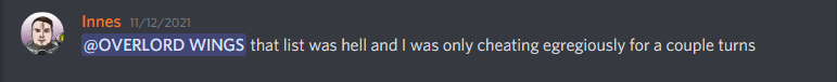 Liam: With those considerations in mind this was less a "game" and more "a game-like experience." Warhammer 40,000 9th edition was technically played. Innes cheated with his pylons for half the game until he noticed that you're meant to choose ONE shooting profile for their main gun, and not just fire both. It didn't matter because I could have shot at the Pylons until 2023 and not killed one, and he needed a game that was about 10 turns long merely to have enough shooting activations to kill the trash on my side of the table. On the plus side, I did manage to kill a Catacomb Command Barge, thanks to his complete inability to roll saves for it. Watching that skeleton idiot die was the highlight of the game, indeed the only positive part of the experience except spending a couple of hours hanging out with Innes in a format where I was unable to lose to him.