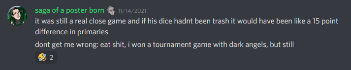 Chase ended up deploying his Tanks in a solid wall around his deployment zone, and sending a couple of them over to the top-left and bottom-right objectives, to feebly bounce their close-combat attacks off of the Darkshrouds. For my part, I sent the Ancients and gun-less Devastators off to hold some ground, and gradually fed my combat characters into the center where he managed to not kill them quickly enough to stem the tide of Oaths points. I was worried I'd run out of guys before the game ended, and I almost did, but those Darkshrouds did Work and the Ravenwing Champion managed to punch a Deathstrike so hard it exploded, which saved me. Chase, to be clear, also rolled some of the worst dice I've ever seen, including a Deathstrike shot that killed zero of my models and put a bunch of mortals on his own tank.