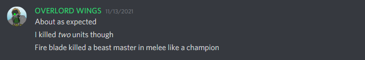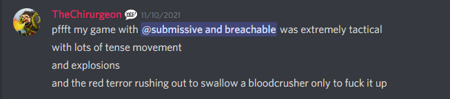 For this matchup, I'll be turning the mic over to James "One_Wing" Grover. As the only other player here who's a big enough rube to take copious notes and do their own write-up, he graciously provided all the documentation I'd need.