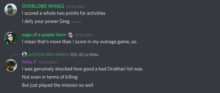 Three points for winning, three more because my T'au list lost, and a bonus point for having our patrons vote my list as the worst of the lot, leaving me in sole possession of first place. These are my crimes. My sentence: I have to play the goddamned Drukhari in round 2.