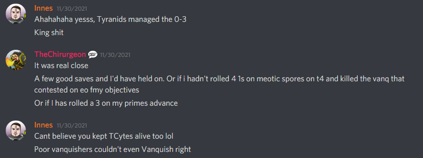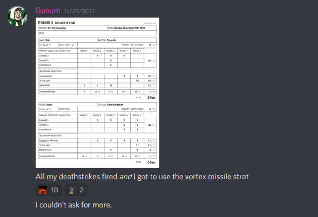 Chase: My game plan going into this game was to use the Vortex Missile stratagem. That mission was accomplished.