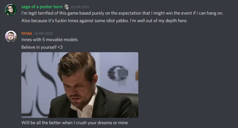 Greg: Honestly, I’m not sure what I expected. Innes apparently went and did actual math here pre-game, playing around until he was able to jam two of his pylons into The Scouring’s absurd little deployment zone with basically unobstructed line of sight to my horrible little gremlin units, whereas my preparation was limited to practicing how much shit I was going to talk after I won.