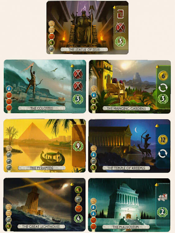 Firstly, because it’s a game based on the 7 Wonders of the Ancient World, it’s heavily centered around the Mediterranean (with Babylon being the furthest East and Egypt being the furthest South). With this in mind, I don’t mind that the extra wonders are mostly Greco-Roman and Egyptian, but then the promo cards being added being the Statue of Liberty and Essen Convention Centre really makes me wish they added some Wonders from further south in Africa (Stelae of Aksum), the Far East (The Great Wall) or Mesoamerica (Nazca Lines) - those would have been really cool and expanded the range.