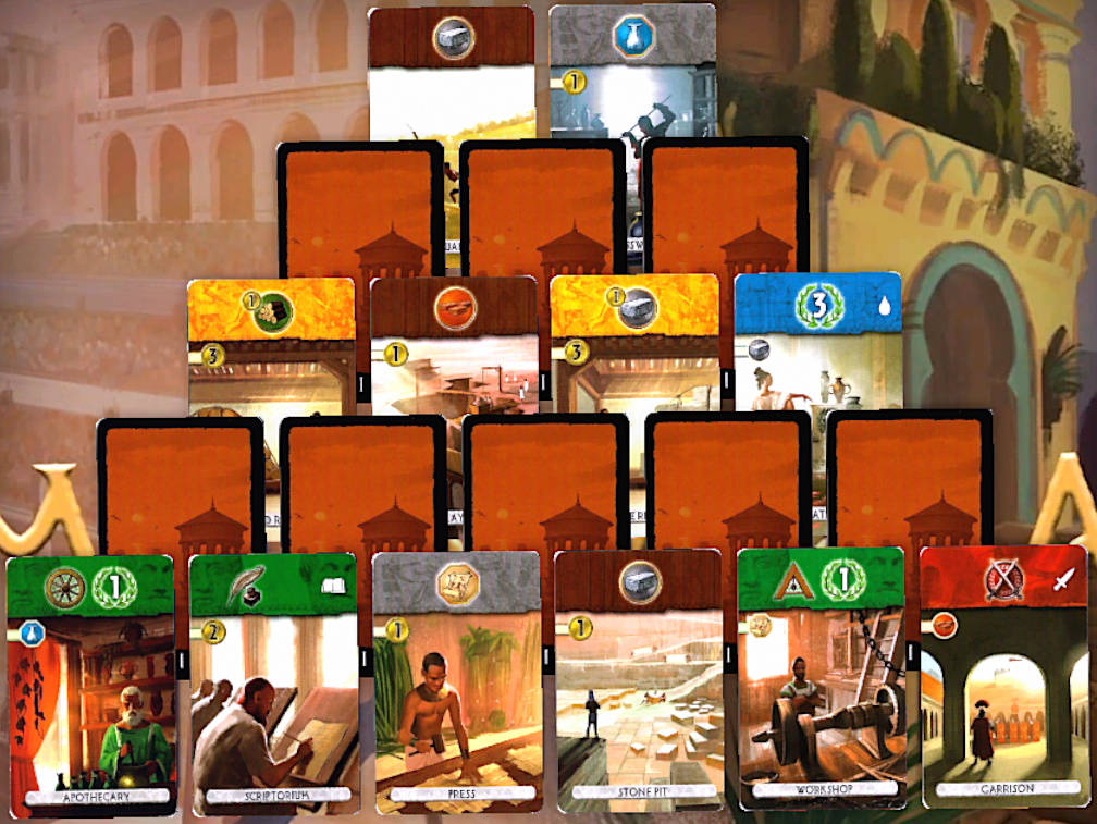 The game begins with the cards from the First Age set up as pictured. During a turn, players take a card from the tableau and can choose to build it, paying the cost in materials and/or gold, sell the card for gold, or use the card to build a wonder. However, players can only take cards that are completely uncovered; if a face down card is completely uncovered, it’s flipped face up.