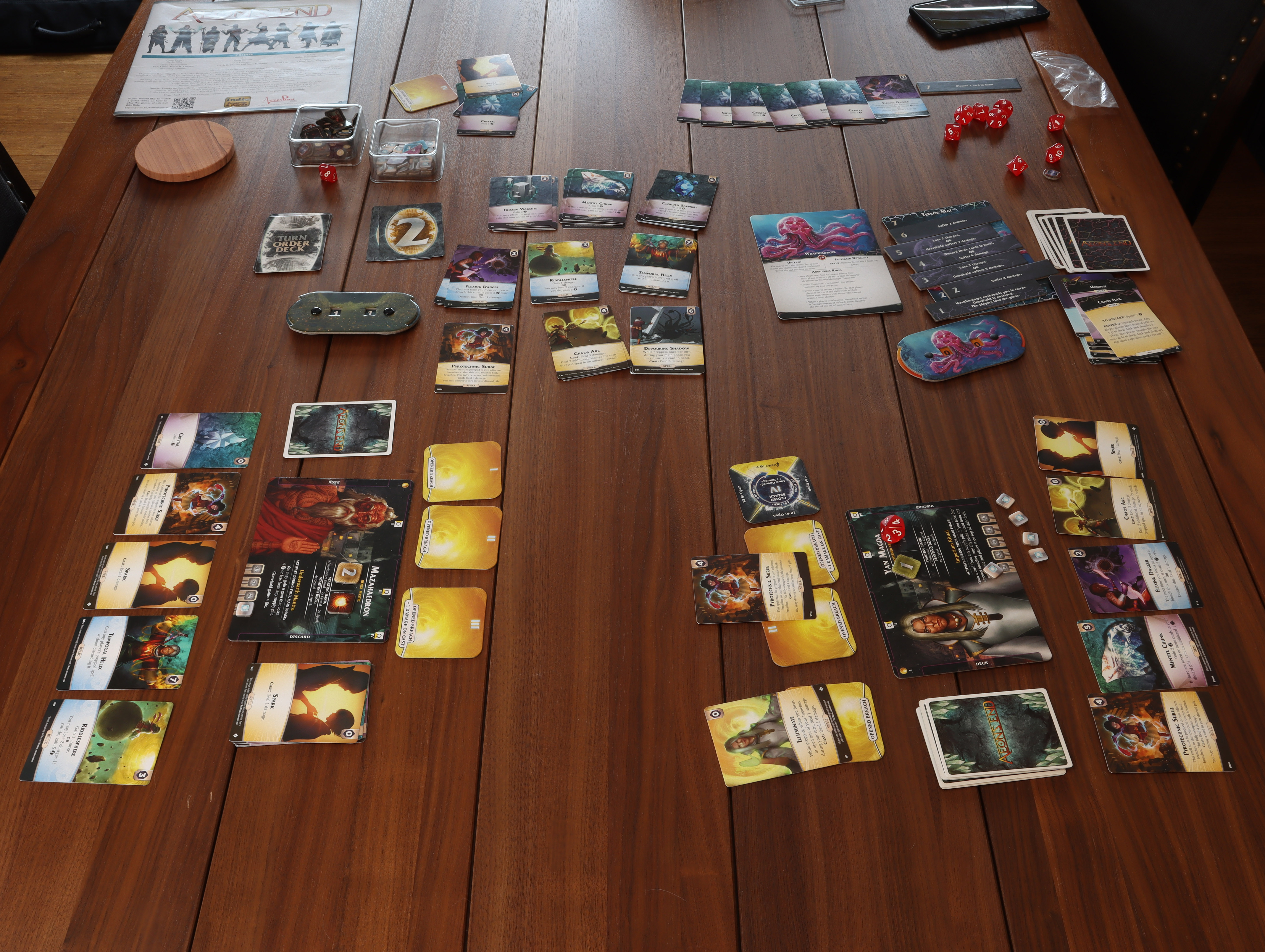 Playing for roughly two hours (including a new player learning the game), the breach mages prevailed! Pyrotechnic Surge and Temporal Helix showed themselves to be a great pairing of cards, where the former deals a mighty 4 damage, and the latter allows for additional casts of your strongest spell. These cards were just two of the nine that made up the random market for this game, and you can see several others scattered among our hands. With these spells chipping away, humanity eventually prevailed and reduced Wraithmonger's health to 0 HP.