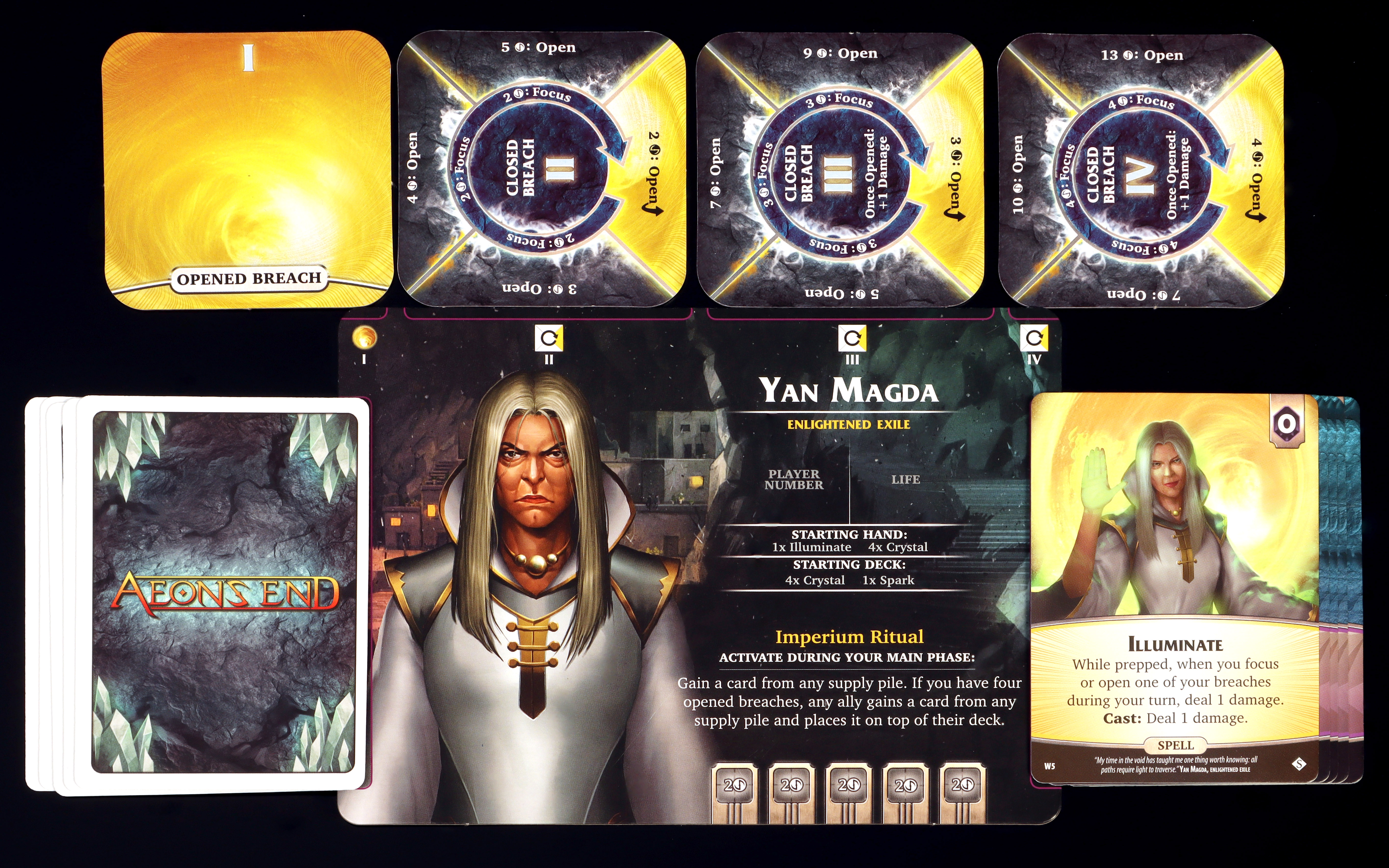 This is our first time looking at the player's tableau. You see the breach mage card, complete with their ability, starting hand and deck, as well as their four breaches represented by the four tiles at the top. Each of those tiles may be used to cast spells, but only when they are