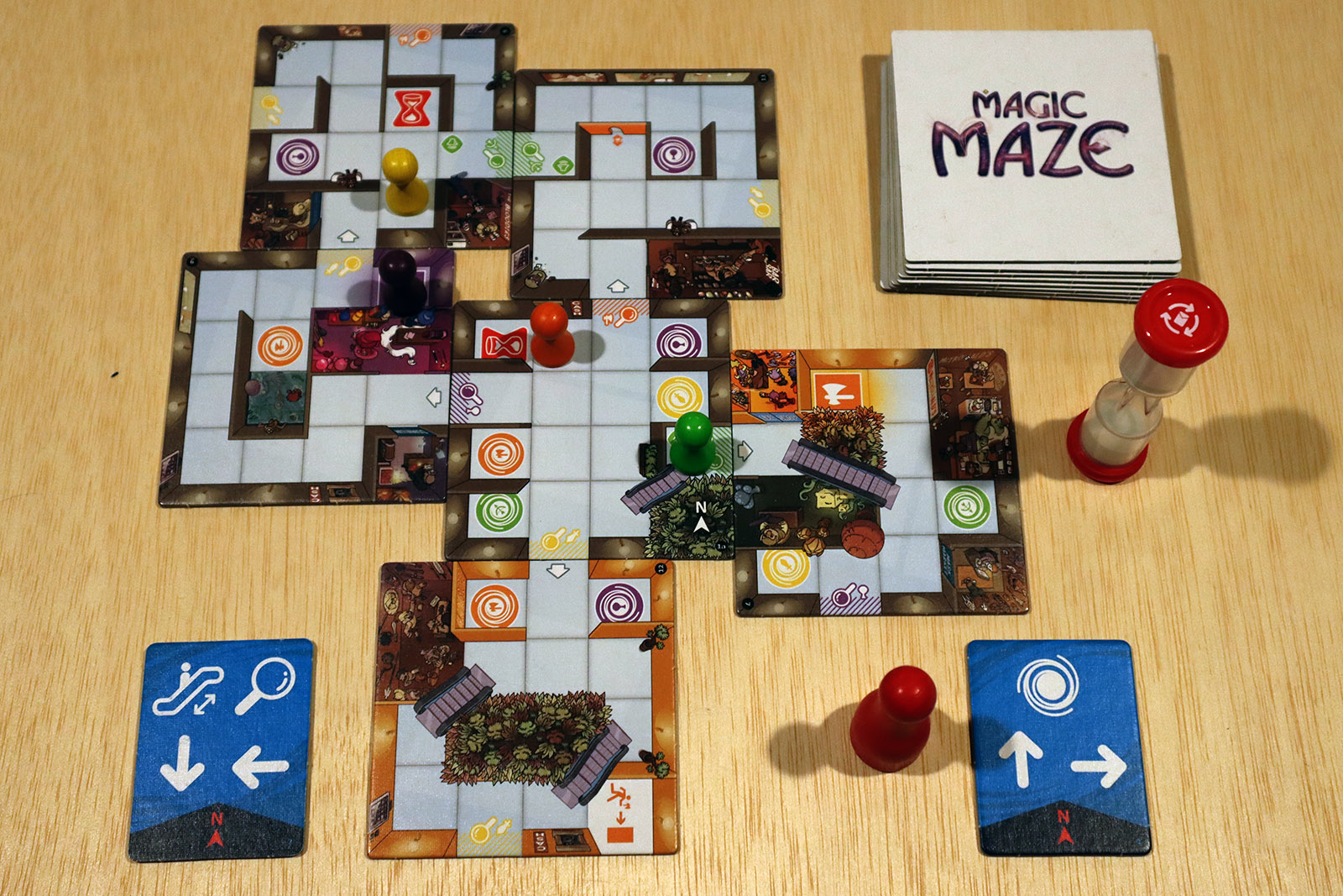 This game is a little different, a little weird. Where other cooperative games encourage you to talk with your friends, this one explicitly prohibits it. Where other games have players taking turns, this one is a frantic scramble where everyone plays simultaneously as fast as they can. Where other games give each player their own character, Magic Maze instead lets every player control every character. Where other games can be dull, Magic Maze is awesome.