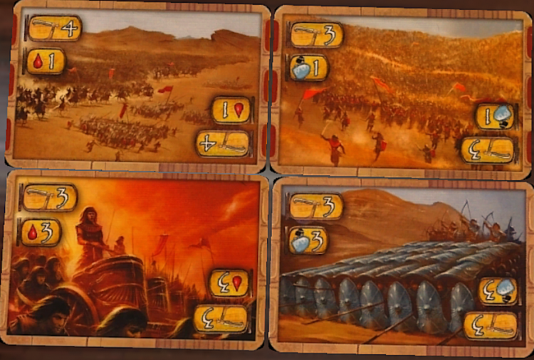 Interestingly, you only lose troops by calculating your opponent’s damage and deducting it from your Defense (and vice versa for your opponent), so it’s entirely possible to win a battle and lose all your soldiers, or lose the battle but suffer no losses. There’s reasons to do this, since if you wipe your opponent’s army but lose you don’t have to retreat. In this way you don’t have to cede map control, which is the name of the game in Kemet.