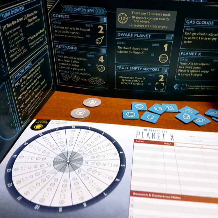 Search for Planet X relies heavily on 2 things – the app to provide all the information, and the ability of the player to capture information logically on paper. The game board is only there to keep track of the player order and show the icons that you can see on your player sheet. The important part really has to do with the capturing and tracking of data on the individual player sheets. If you are really good at keeping track of data and being able to keep track of your notes, then you’ll do great at the game. The reverse is true, in that if you are not good at keeping track and organizing your notes, then you may have a hard time with the game.