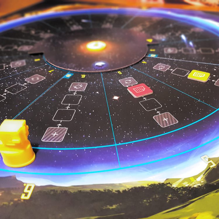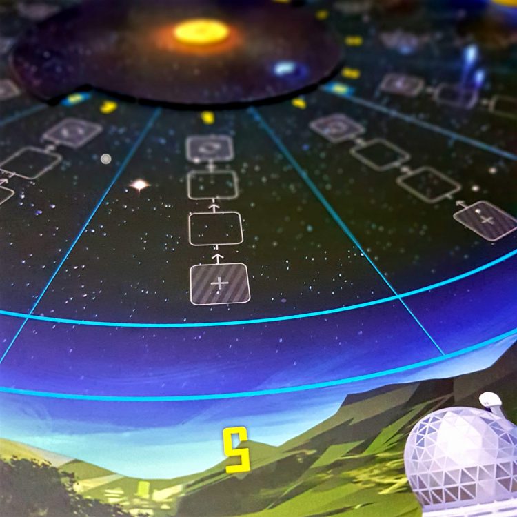 The Earth Core board in the middle is what will indicate the number of visible sector’s and will change as players move around the board. There is a visual indicator on the left edge that should always be pointing to the sector that has the furthest back player token on it, and as player move around the board, this will move with them, always staying the with furthest back player.